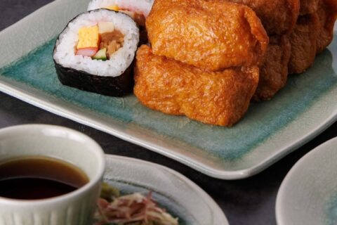 伝統の御深井焼(おふけやき)の器に盛りつけた、稲荷寿司と蕎麦。 鈴木克弥さんの手...